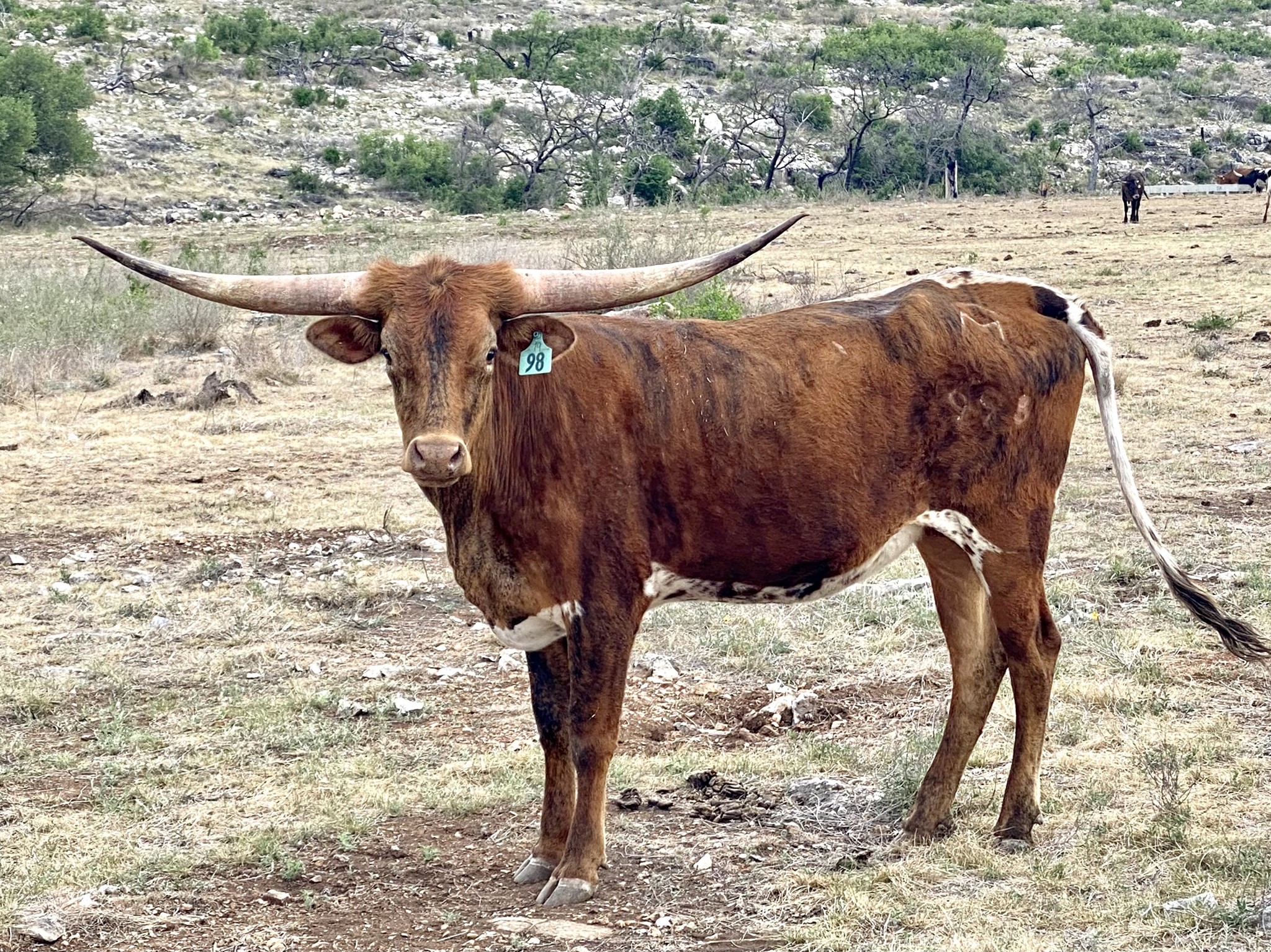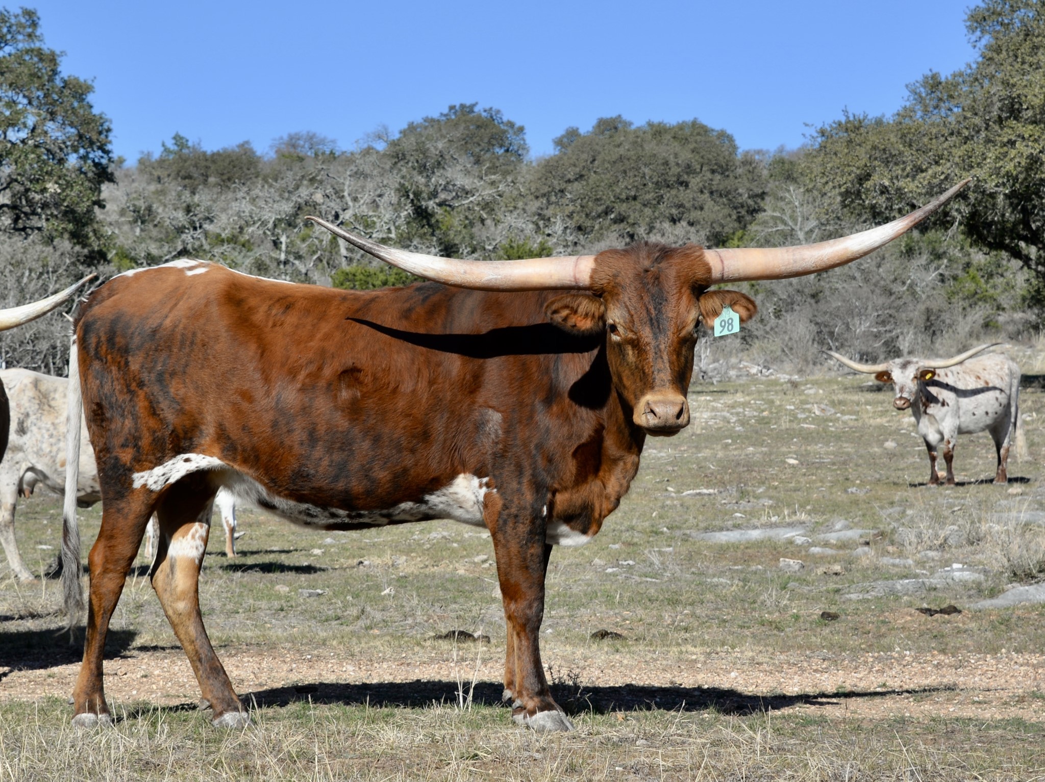 Gorgeous brindle heifer with a long, large body and a lot of height. She has a fabulous lateral horn set with the ends hooking for what looks to be the start of a nice twist. She's exposed to KDK Leo for her fourth calf.