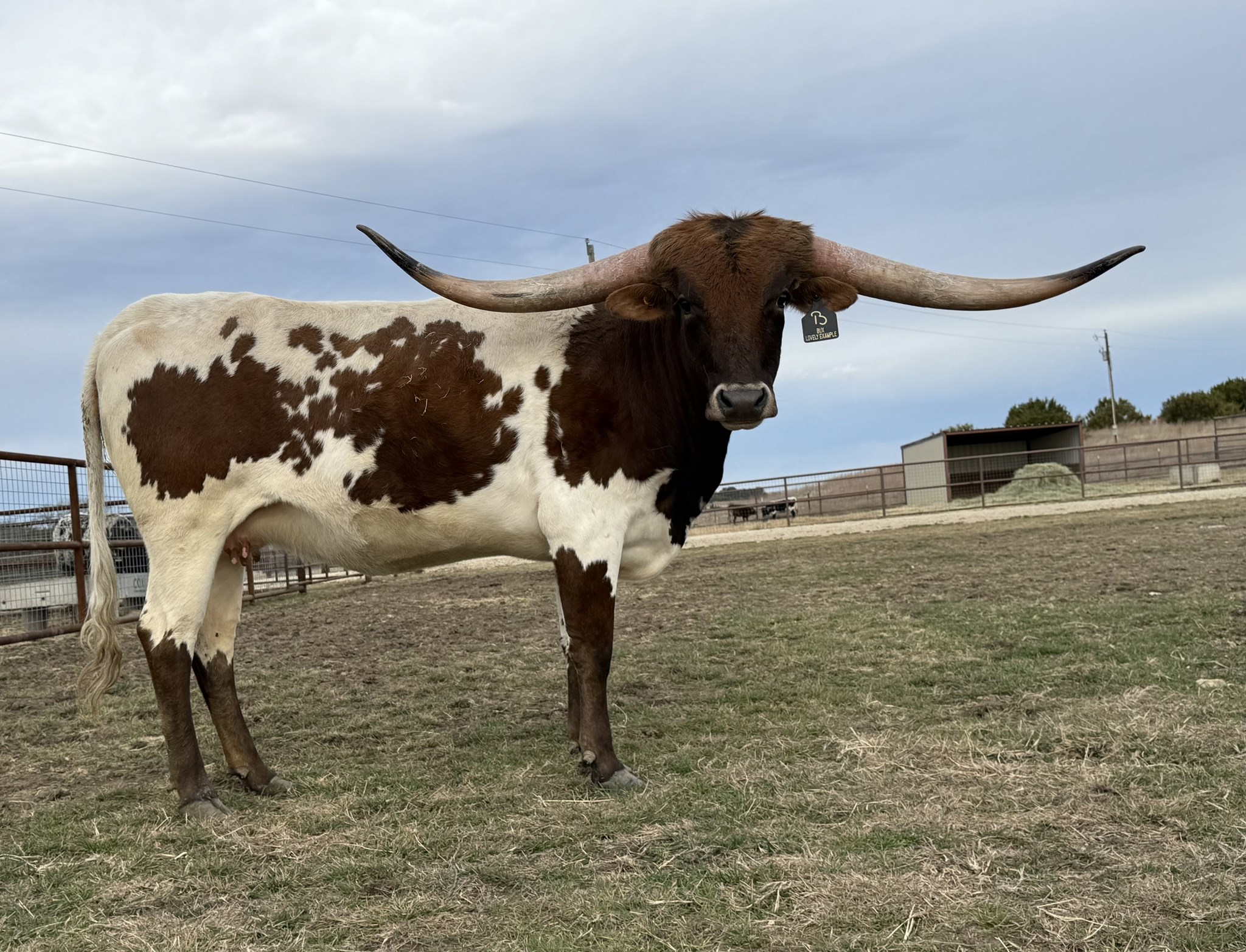 Bux Lovely Example is an exceptional young heifer that perfectly showcases the best of Buxton breeding — a blend of eye-catching color, balanced conformation, and elite genetics. She’s sired by Hubbells 20 Gauge and out of Horseshoe J Promising, who carries the influence of the great Cowboy Catchit Chex and Horseshoe J Lovely. Her pedigree reads like a who’s who of proven producers: Concealed Weapon, JP Rio Grande, Cowboy Chex, and BL Rio Catchit — all names synonymous with predictable horn growth and strong maternal lines. Lovely already shows tremendous promise with her straight back, correct build, and early horn direction that’s following beautifully. Her rich red-and-white coat and graceful presence make her a natural standout in the pasture. With her genetic depth and feminine frame, she’s built to become a cornerstone female in any serious program.