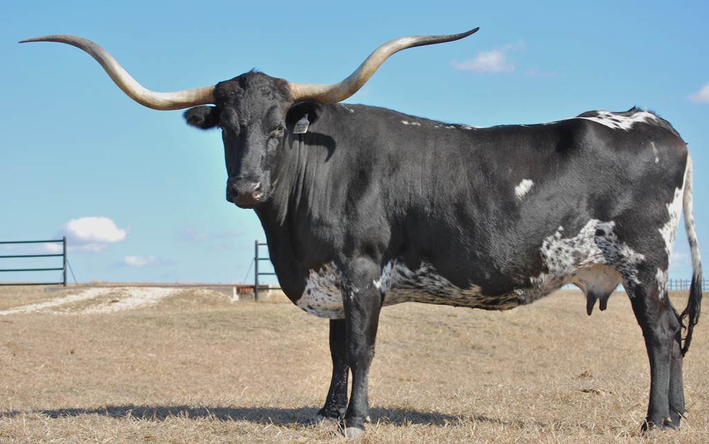 This big, black and white cow is a real standout. Her triple twisty horns are over 78"TTT and 93" of total horn.Her calves are great and she produces a lot of heifers. Her entire pedigree are big horned longhorns.